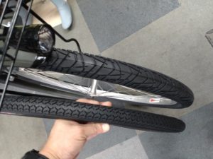 この自転車の特徴は何と言っても太めのタイヤ、ワイドなカゴです。