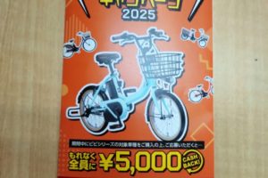 こんにちは! 今回はちょっぴりお買い得?情報です。 6月中に対象車種をご成約頂き、ご応募していただくとメーカーから5,000円キャッシュバックというものです。 お得なこの時期に是非快適な電動アシスト付き自転車を! ※なお …