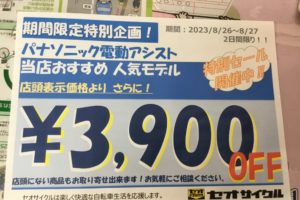 こんにちは! 急遽決まりました! 本日、明日(8月26日、8月27日)限定でPanasonicの電動アシスト付き自転車が 店頭価格より3,900円OFF!! 店頭のPanasonic電動アシスト自転車が当店は売り切れてし …